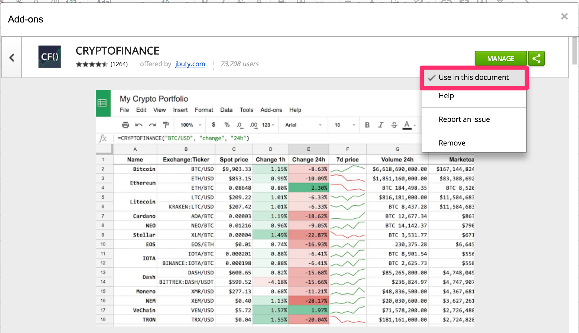 1. Đầu tiên cài đặt Google Sheets Add-On (CRYPTOFINANCE) về trình duyệt.